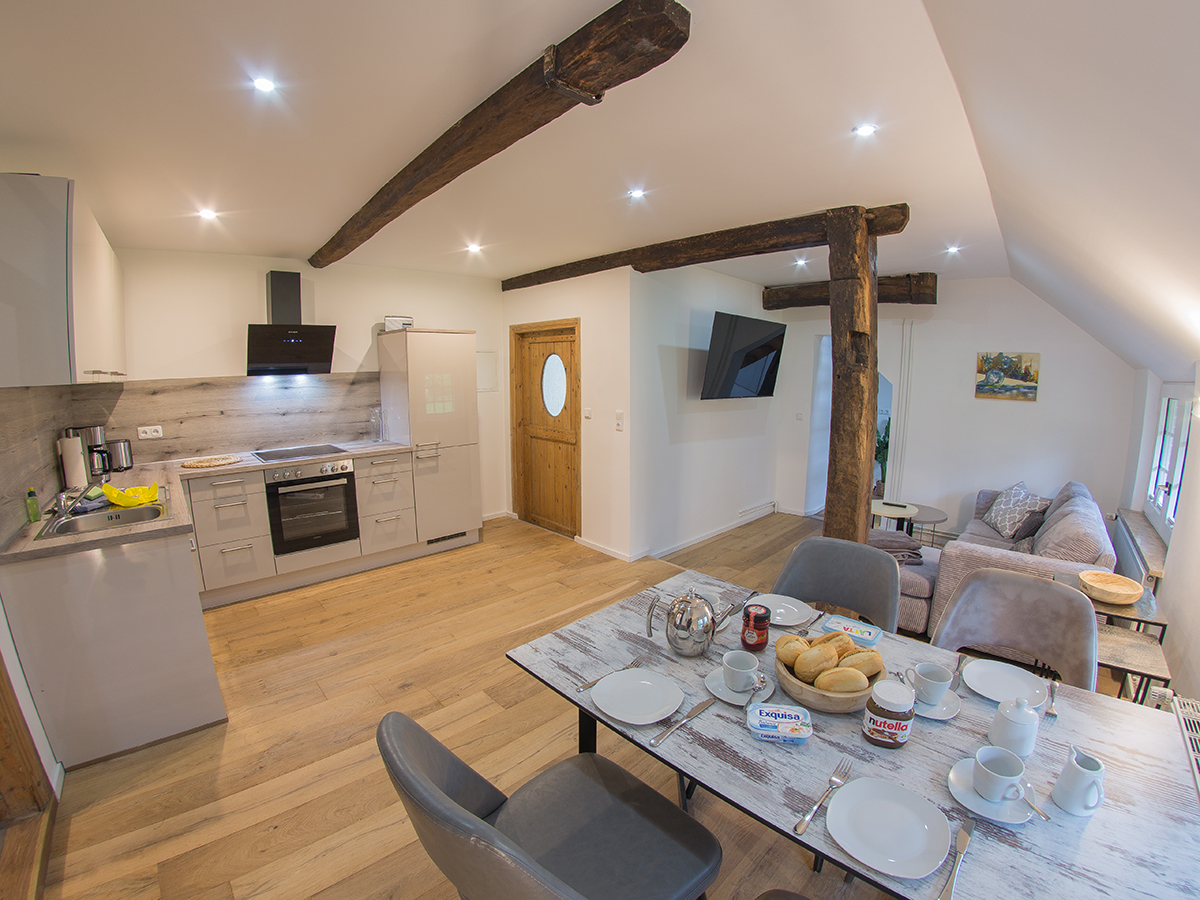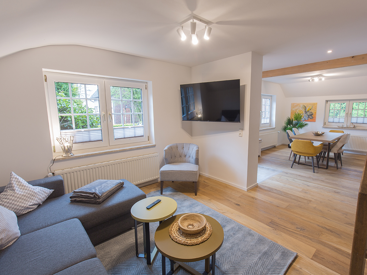 Die Wohnungen Reethuus 5 bis 7 sind im liebevoll renovierten, denkmalgeschützten Reethaus aus dem 17. Jahrhundert untergebracht, offenliegende Balken und historische Fenster zeugen von der Geschichte des Orts und sorgen für ein gemütliches Ambiente.